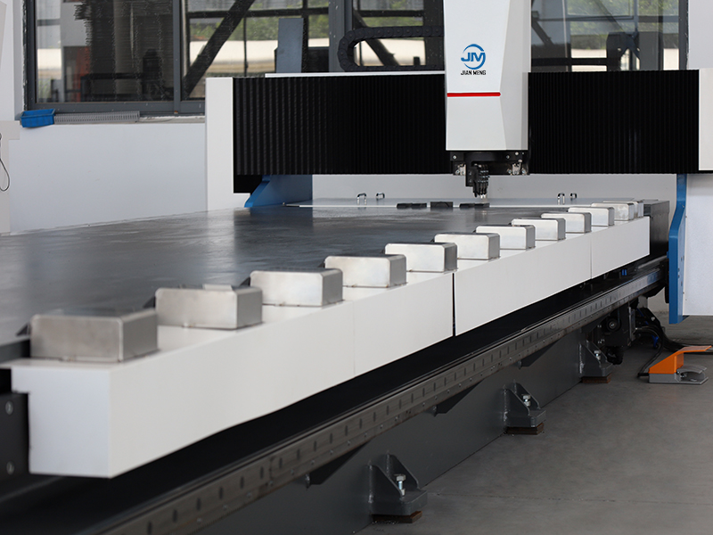 The Automatic four side V grooving machine is based on a horizontal gantry frame, and the machine base and crossbeam are tempered in an electric furnace to eliminate welding stress, ensuring high rigidity and stability of the machine tool; The overall rack undergoes CNC precision machining for one-time clamping, ensuring that the installation surface is parallel and perpendicular; Low alloy, high-strength steel countertops are processed by self planing to be flat and smooth. During processing, the plates remain stationary to avoid wear and tear, making them particularly suitable for precision machining of decorative and mirror finish plates.