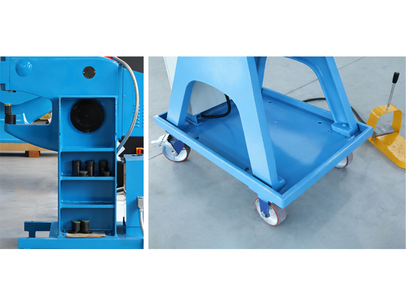 Optional oversized cabinet stores dies and spares for faster changeovers. Swivel casters enable quick relocation and locking; the caster area doubles as temporary storage for on-site tooling swaps.